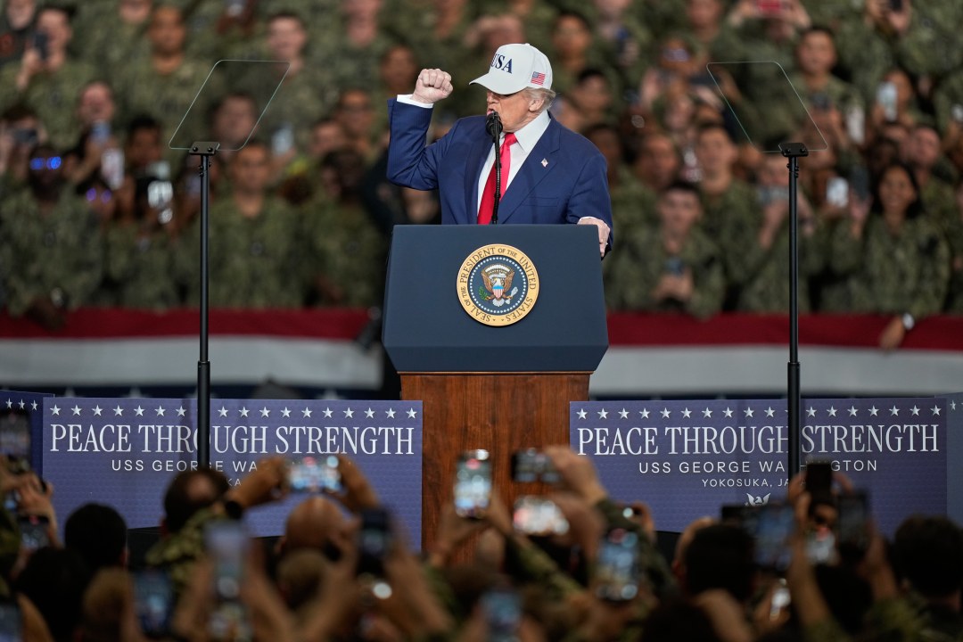 Trump addressed the soldiers from the aircraft carrier docked south of Tokyo for almost an hour, during which he praised Defense Secretary Pete Hegseth and touted the military no longer being “politically correct.”
